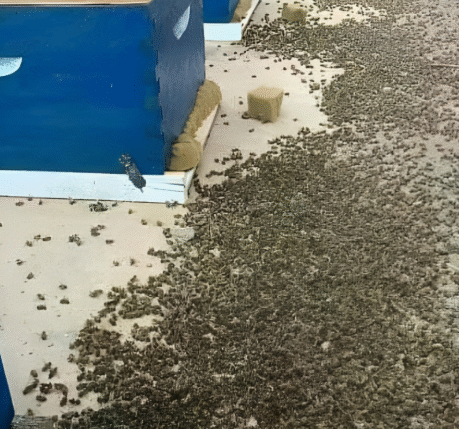 Niestety, mamy tu tysiące martwych pszczół, dotkniętych stosowaniem pestycydów w naszym kraju. Niestety, nasz cykl życia gdzieś się tutaj kończy.
