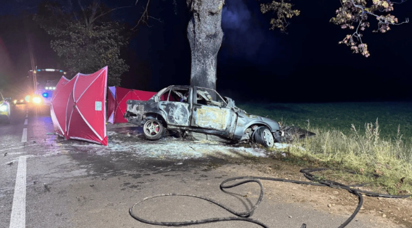 Do wypadku doszło w piątek, 11 października przed godziną 18, na drodze powiatowej w miejscowości Radacz (pow. szczecineckim). Osobowe BMW wypadło tam z drogi i uderzyło w drzewo. Pojazd, którym podróżowały dwie osoby, został niemal rozerwany na pół. Chwilę później pojawił się ogień. Na miejsce natychmiast zostały wezwane służby ratunkowe.